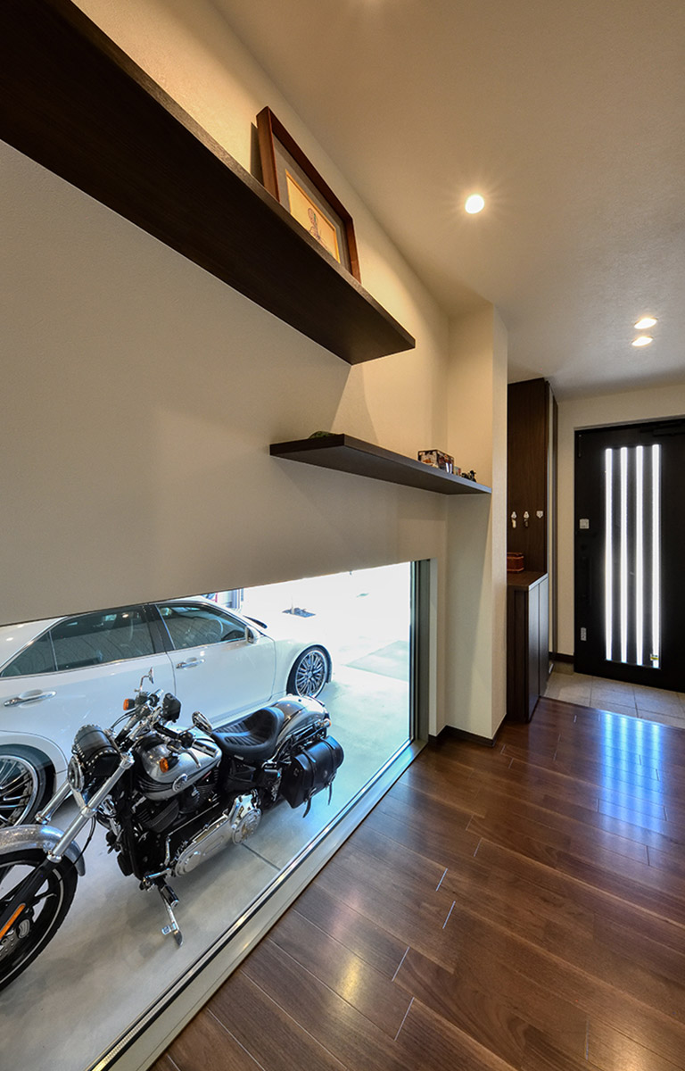 リビングの一面に大きな窓を配しガレージ内の愛車を常に眺められるように設計しました。また、玄関ホールにも窓を設け帰宅時や玄関ホールを通るたびに愛車を身近に感じていただけます。
