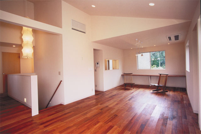 スキップフロアーの3層住宅。1Fには土間応接室と中庭で、外壁で囲まれた内部空間は新鮮であったと思います。内部、外部ともに色調については何度もやり直し、仕上げ・テクスチャーに注力しました。