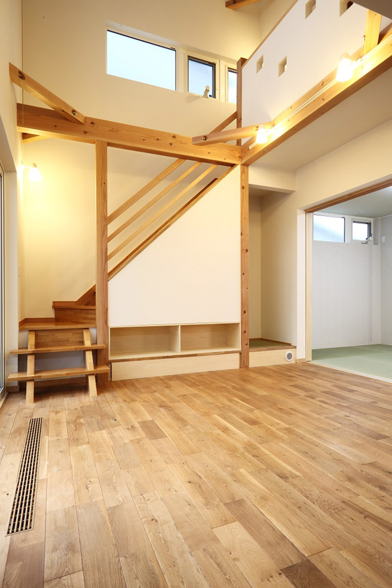 家づくりの頃はまだ子どもさんが小さかったので、LDKや隣の和室のどこにいてもそれぞれの空間を見渡すことができ、いつも家族のつながりを感じられる間取りをご提案しました。また開放感のある吹抜が、光と通風をもたらしてくれるだけでなく、室内の快適さの重要なポイントになっています。