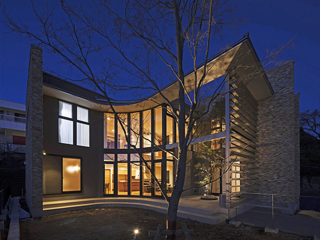 小田原市の相模湾が一望できる6mもの高低差をもつ丘陵地。ここに佇むのは四季の表情と時の移ろいに寄り添う住まいだ。日々の生活のなかで多くの時間を過ごすリビング、ダイニングは吹き抜けとし、緩やかな曲線を描く大きな開口を確保。天井まで伸びるそのガラス越しには悠々たる山並みが青々と美しい。