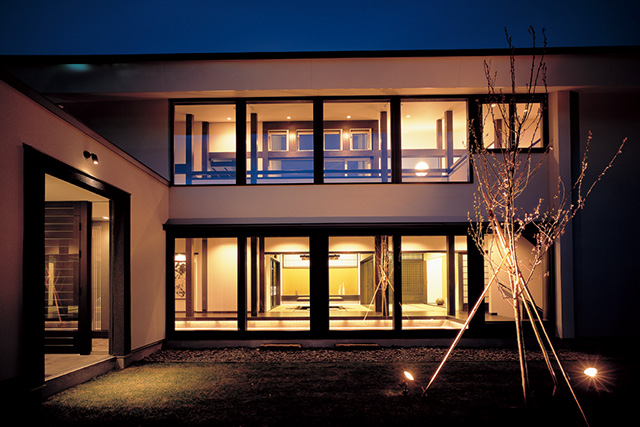外観はスタイリッシュな片流れ屋根をもつ洋風の仕様。日本の伝統の上に立脚しつつも、現代的な感覚を取り入れた邸宅だ。