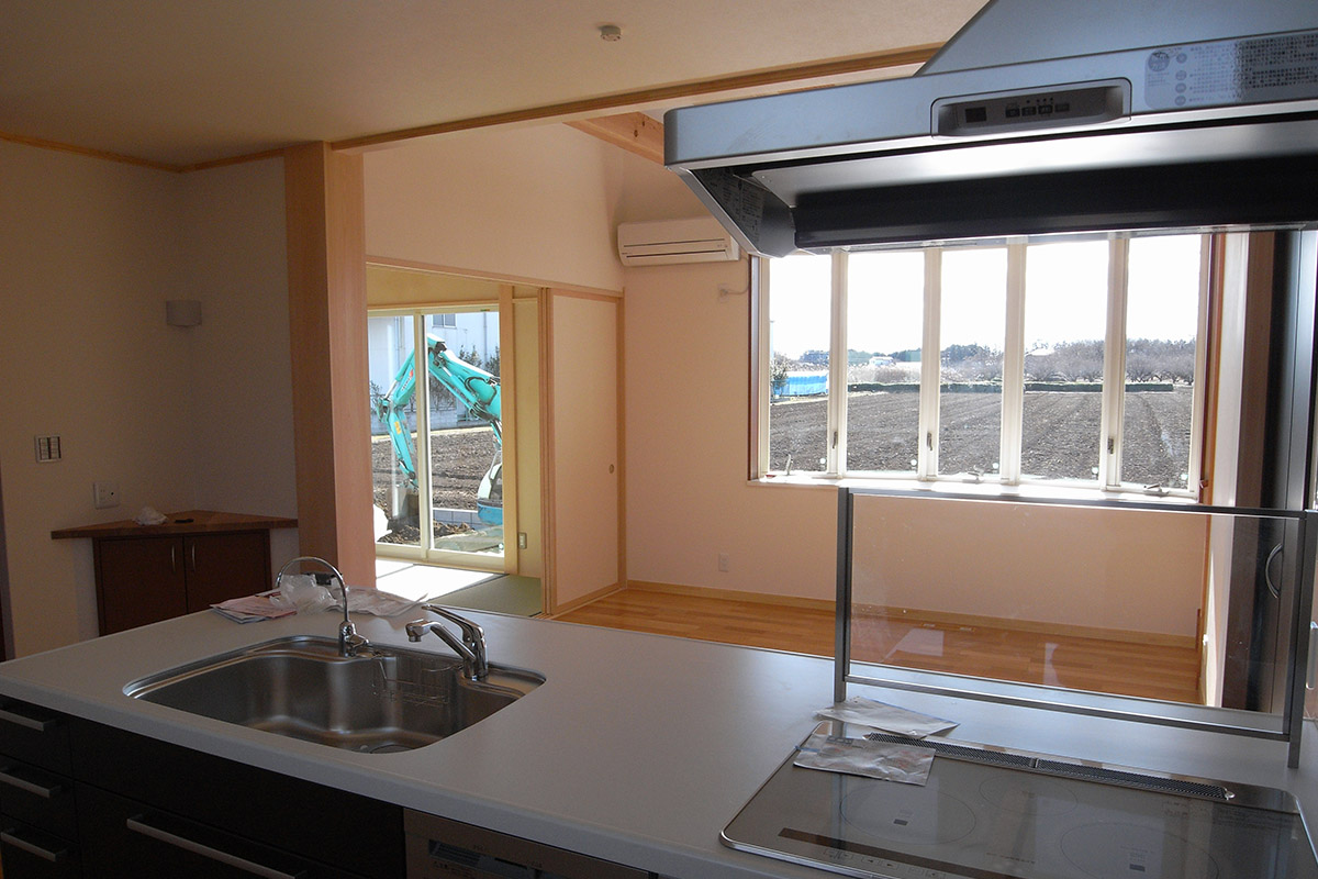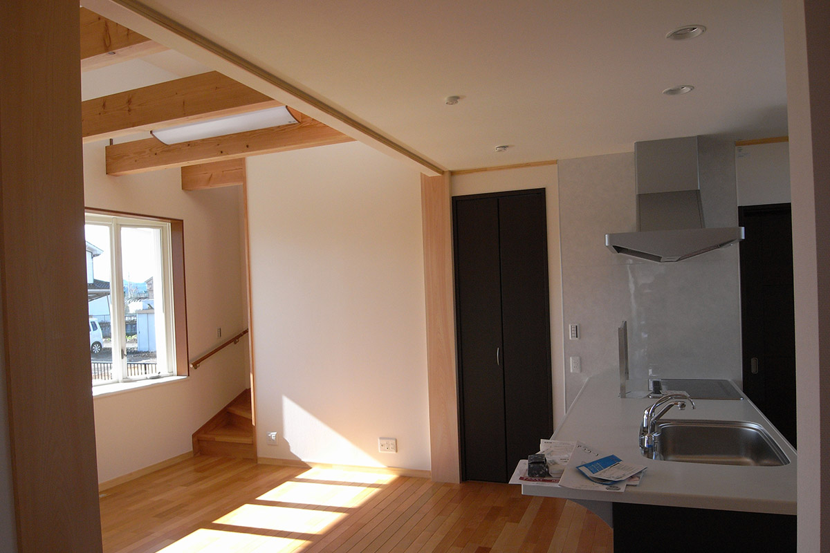 蓄熱式の床暖房(基礎に組込)でなんとなく温かい(ここち良い)建物の内部空間や珪藻土などの塗り壁・無垢の大黒柱など、又、いつ来るか分らない大きな地震にも備えて制震部材をセットし耐震性を高めた建物にしています。