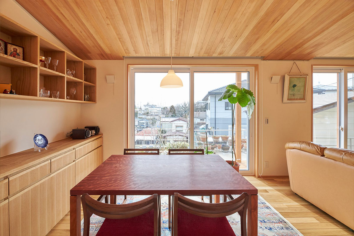 高台からの眺望を楽しめるよう計画したリビングダイニングには、読書好きな旦那さまのために、壁面の本棚を設けるなど、趣味を楽しめるよう工夫しました。