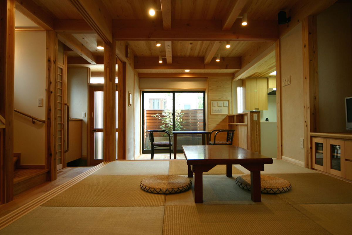この住まいは設計者の私の自邸です。今までの建築主さんに提案してきた自然素材を使いながら、雨水や緑、風など自然のエネルギーを利用する実験的な試みもしています。