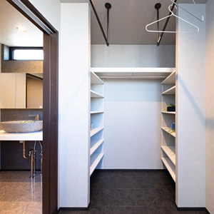 • 洗面所と脱衣室の中間にあるランドリールームにある機能的でシンプル収納