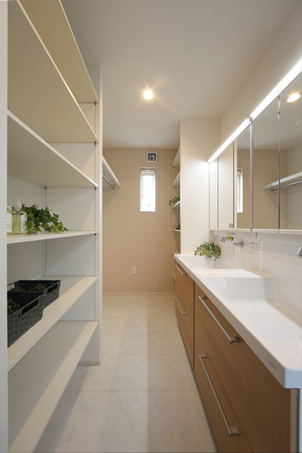 • 広々とした可動棚と枕棚で収納豊富な木目調の洗面台が機能性とデザイン性を兼ね備えたサニタリールーム