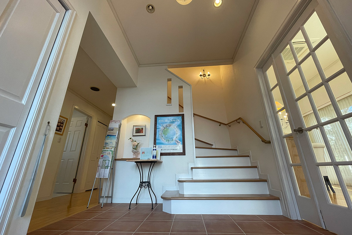 • 吹き抜けのある開放的で明るく迎えるエレガントな階段のある玄関(エントランス)