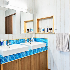 青いタイル壁とナチュラルな木材の棚の造作の洗面...