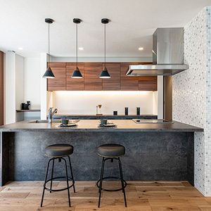 落ち着いた色合いの壁と対面カウンターで家族との...